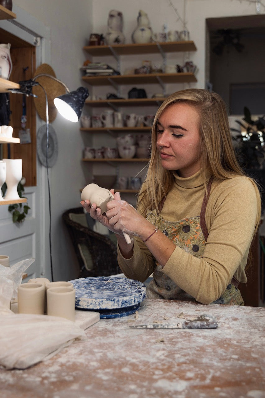 Captivated by the way skin shrinks and swells, wrinkles and stretches, I create seemingly animate forms that emulate the body’s undulating, dynamic exterior. I am compelled to use our own tactile surfaces as a way to relate to clay, which similarly has memory and movement. By creating altered porcelain tableware, I find that most shapes are easily personified and related through posture, poise, hips, elbows, and most closely- use. A porous matte glaze blushes and weeps amongst subtle pale surfaces to mimic an intimate, tangibly comparable softness and vitality of skin. Supple, rounded curves give each vessel a lively essence, quietly illuminating similar bodily qualities.